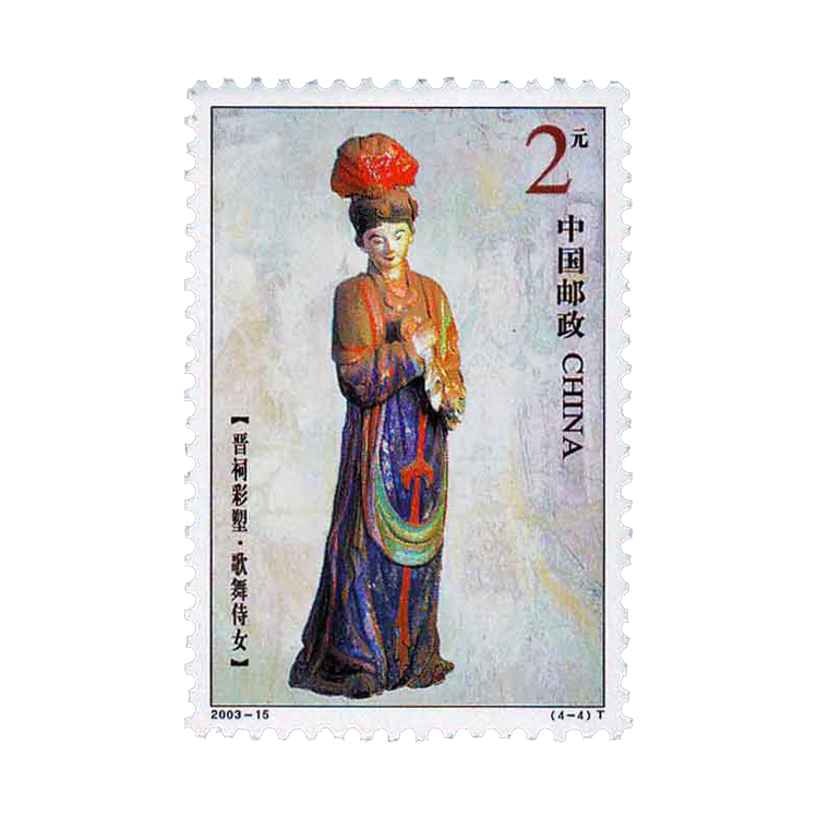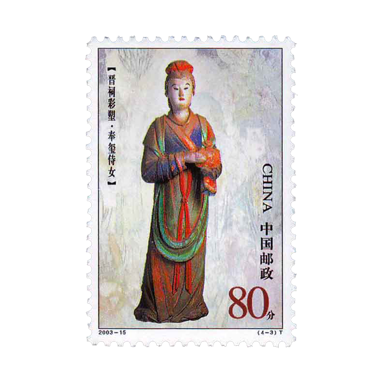2003年8月16日,为了纪念太原建城2500周年和展示历史悠久的彩塑艺术,国家邮政局发行了《晋祠彩塑》特种邮票,全套4枚,同时发行小版张1套2版。