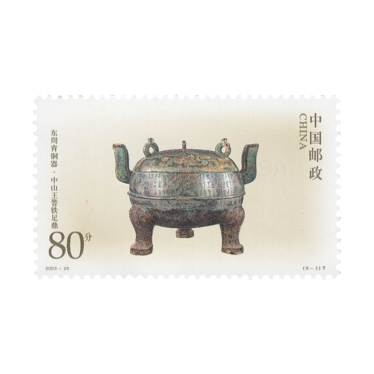 2003年12月13日,为了展示中国古代铜器艺术的辉煌成就,国家邮政局发行了《东周青铜器》特种邮票,全套8枚,同时发行以“中山王铁足鼎”为主图的小版张1套1版。