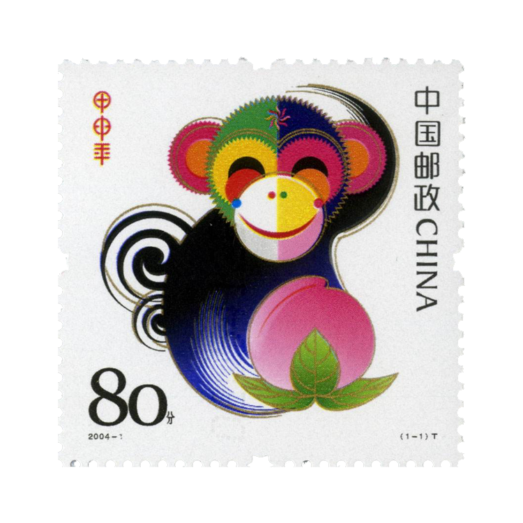 在这枚邮票中,设计者运用统一、单纯的几何图形为生肖猴子造型,画了大大小小的圆组成猴头,圆中有圈,圈中有圆;硕大的头,卷曲的尾,眉开眼笑,绘画元素虽然单一,视觉冲击力却很强烈,图案也很写实。猴子脸上丰富的色彩及色块之间的相互对比,猴脸多变,手舞足蹈,形神兼备,接近于民间艺术品的用色,给读者带来愉快的视觉享受。再加上“那猴头”一脸顽皮的笑模样,他一手挠头,一手捧着一个鲜红鲜红的硕大蟠桃,不仅使节日的喜庆气氛愈加浓郁,也具有“金猴献瑞”的吉祥寓意。从生肖猴的整体形象看,它不仅符合现代人的审美情趣,而且还保留了传统生肖文化的韵味,凸显了平民化、宠物化的设计基调,给人提供了一种美的享受。