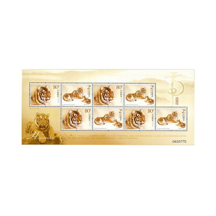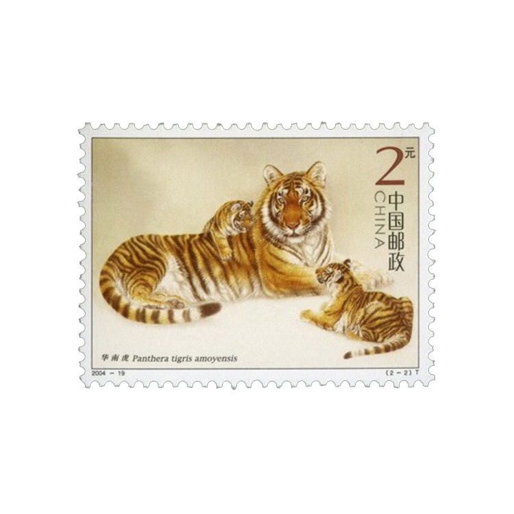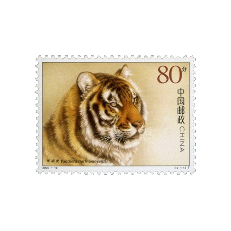华南虎又称中国虎,其个头比孟加拉虎小,与印度虎差不多,但其皮毛颜色比它们都要深一些,毛也长,虎纹要宽。其典型特征是头部有鲜艳的“王”字斑纹,是中华民族高尚、勇猛和威武的象征。由于多年来的毁林、滥杀以及猎捕,华南虎已从1949年的4000余只减少到现在的不足百只,因此华南虎也成为我国三大野生动物拯救工程之一的濒危动物。为了唤醒人们对华南虎的保护意识,国家邮政局将于2004年8月23日发行《华南虎》特种邮票,全套2枚,面值分别是80分和2元,发行量1000万套,另发行85万版单版式小版张,邮票志号2004-19T。