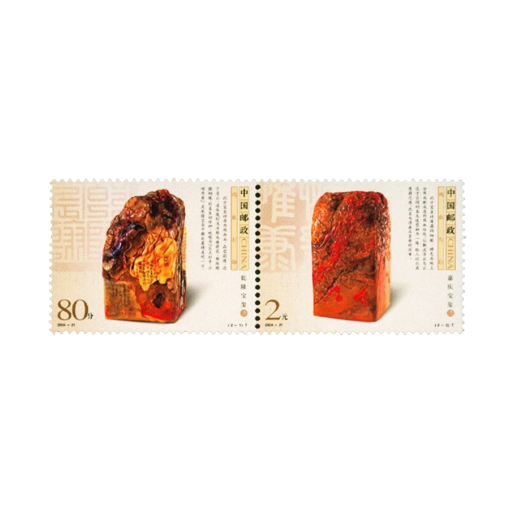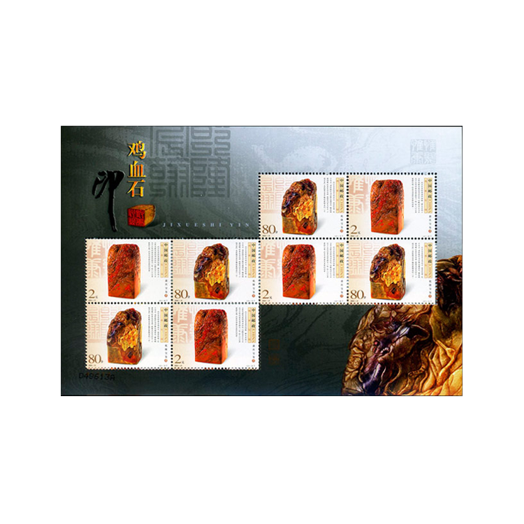 2004年9月17日,为了展示中国印章雕刻艺术成就,国家邮政局发行了《鸡血石印》特种邮票,全套2枚。