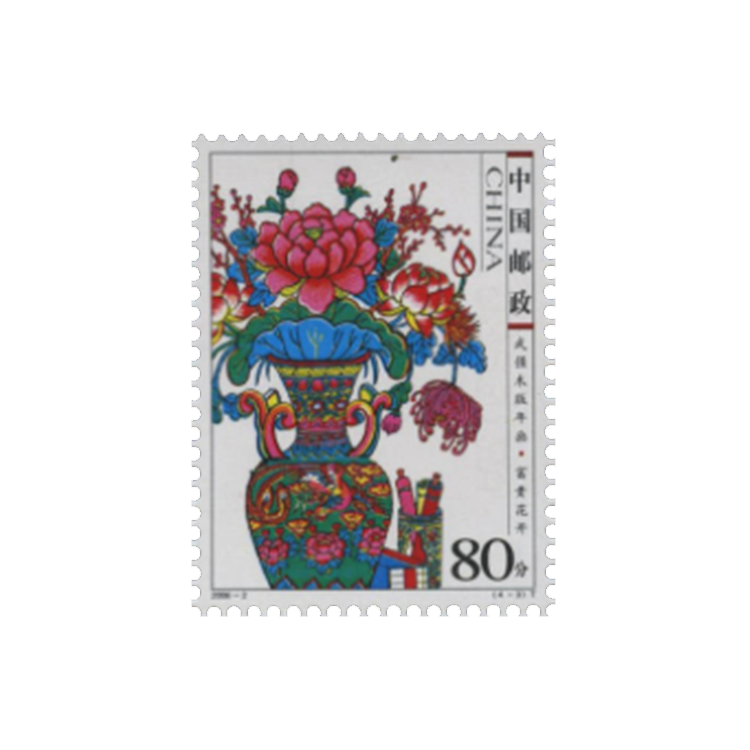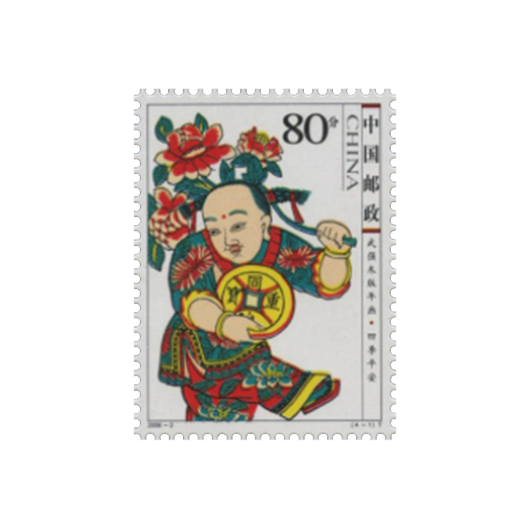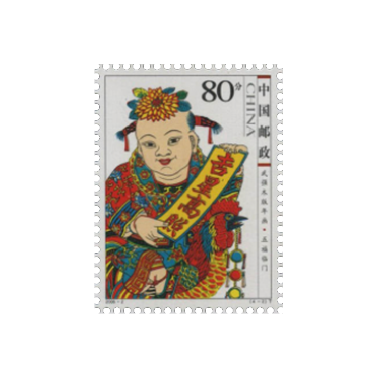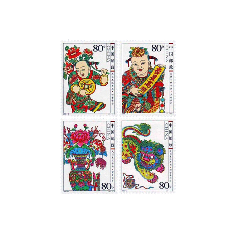 年画是我国民间特有的一种美术形式,最早始于秦汉时期。当时,人们每逢除夕便在门户上画神荼、郁垒及老虎,用以驱除鬼魅等不祥之物。至宋代,开封、杭州的岁末市场上有门神、钟馗等神像出售。明中叶以后,雕刻印刷中的彩色套印技术趋于成熟,促进了木版年画的绘制行销。年画的表现内容和题材越来越广泛、丰富。凡带有喜庆内容的风俗生活、传统戏曲小说中的历史人物、神话故事、山水花鸟、吉祥图案等都在年画中有所表现。全国各地陆续出现了许多年画产地,其中,天津的杨柳青、江苏的桃花坞、山东的杨家埠、河北的武强以及四川的绵竹最负盛名。为宏扬我国木版年画这一特有的文化遗产,国家邮政局从2003年起,连续5年于农历小年这一天发行杨柳青、桃花坞、杨家埠、武强、绵竹五地木版年画专题系列邮票恭贺新春,为传统佳节增添吉祥喜庆的气氛。