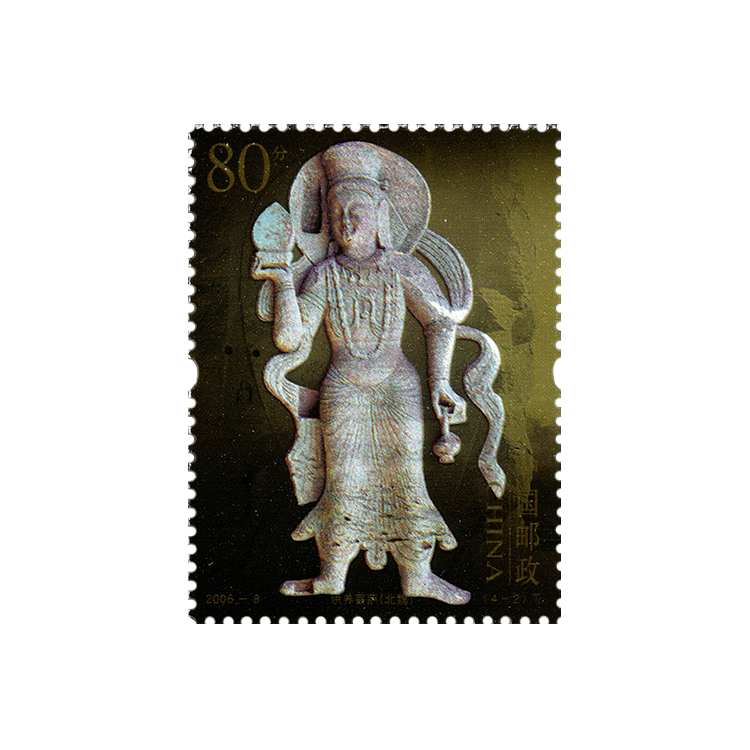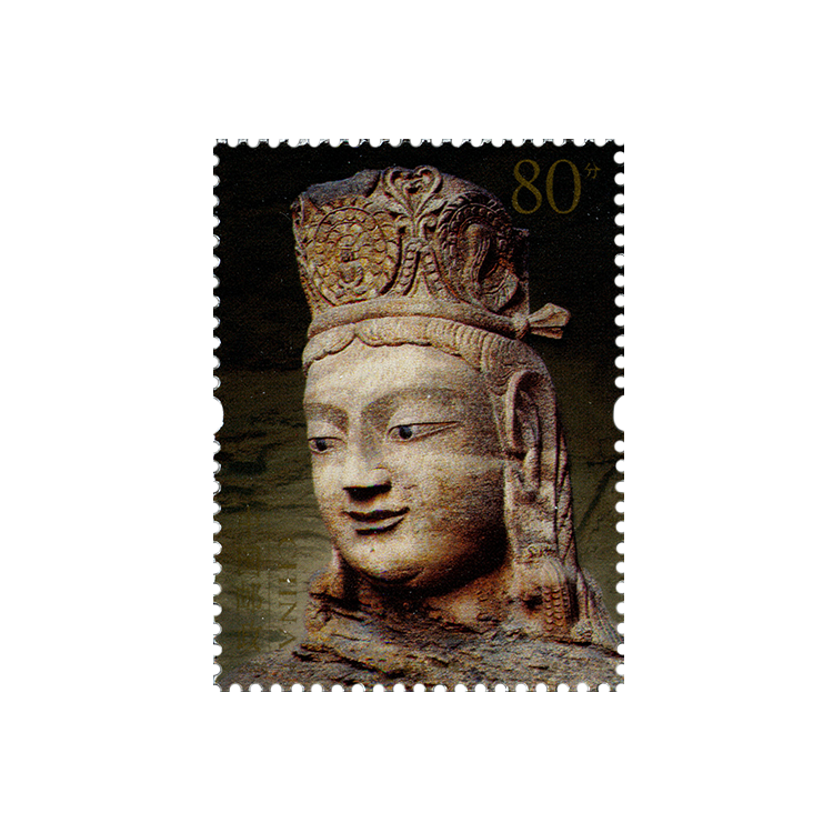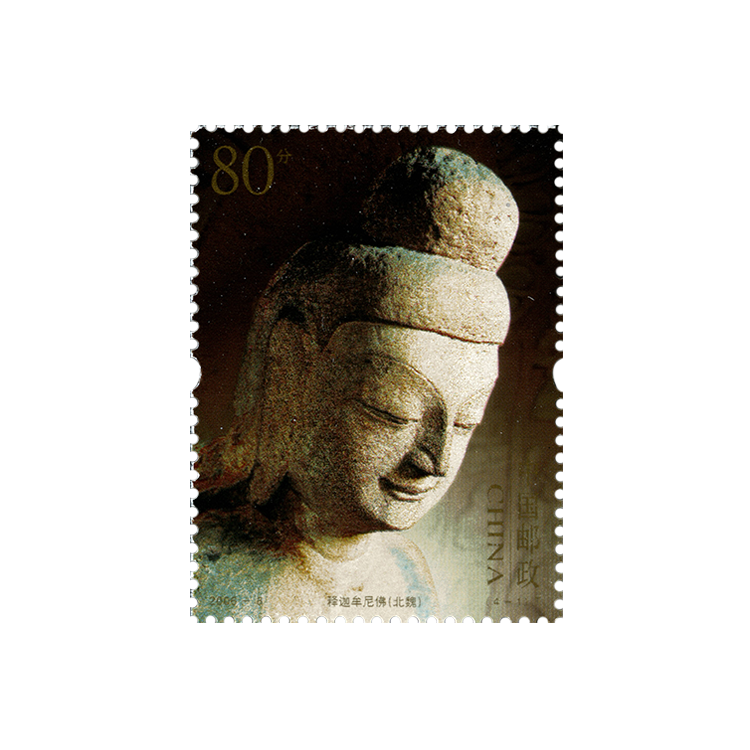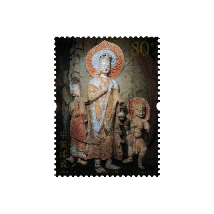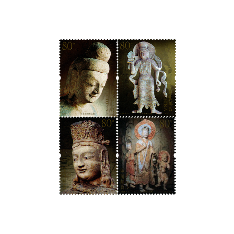 国家邮政局发行的《云冈石窟》特种邮票,全套4枚,小型张1枚。图案依次为“释迦牟尼像”(头部)、“供养菩萨”、“供养菩萨”、“胁侍菩萨”和“释迦牟尼像”(上身)。我国著名的四大石窟艺术全部绘入邮票。