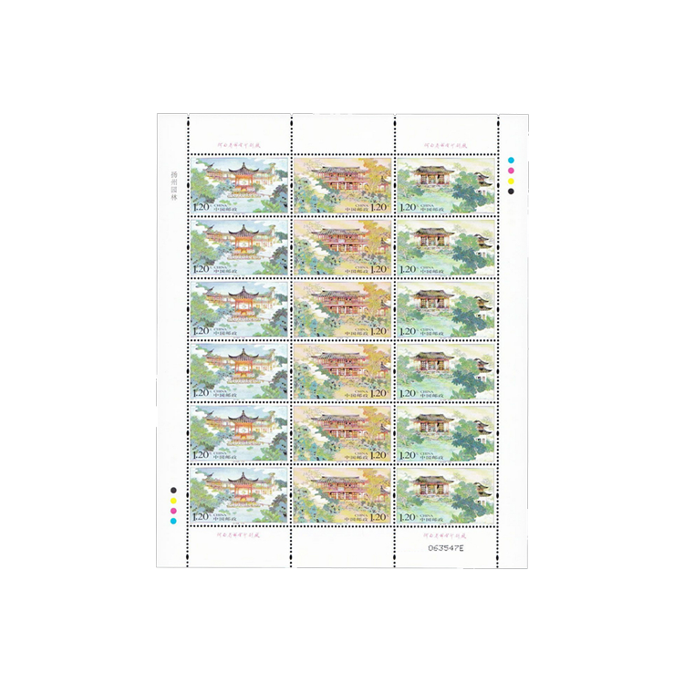 扬州园林素负盛名,《扬州画舫录》有“杭州以湖山胜,苏州以市肆胜,扬州以园林胜,三者鼎峙,不分轩轾”之句,后来,经过多次变乱,扬州园林很多都荒废了。但是,直到现在还保留着一些很有特色的、秀丽多姿的园子。有人认为,扬州园林是北方皇家园林与南方私家园林之间的一种介体,其原因一是清帝南巡,四商杂处,交通畅通;二是南北园林匠师技术交流的结果。扬州园林既具有皇家园林金碧辉煌、高大壮丽的特色,又有大量江南园林中的建筑小品,自成一种风格。《扬州园林》特种邮票由苏州画家吴越晨先生绘制设计,共发行八百万枚。《扬州园林》特种邮票表现了建筑的精巧、历史的深厚和国画艺术的练达 。