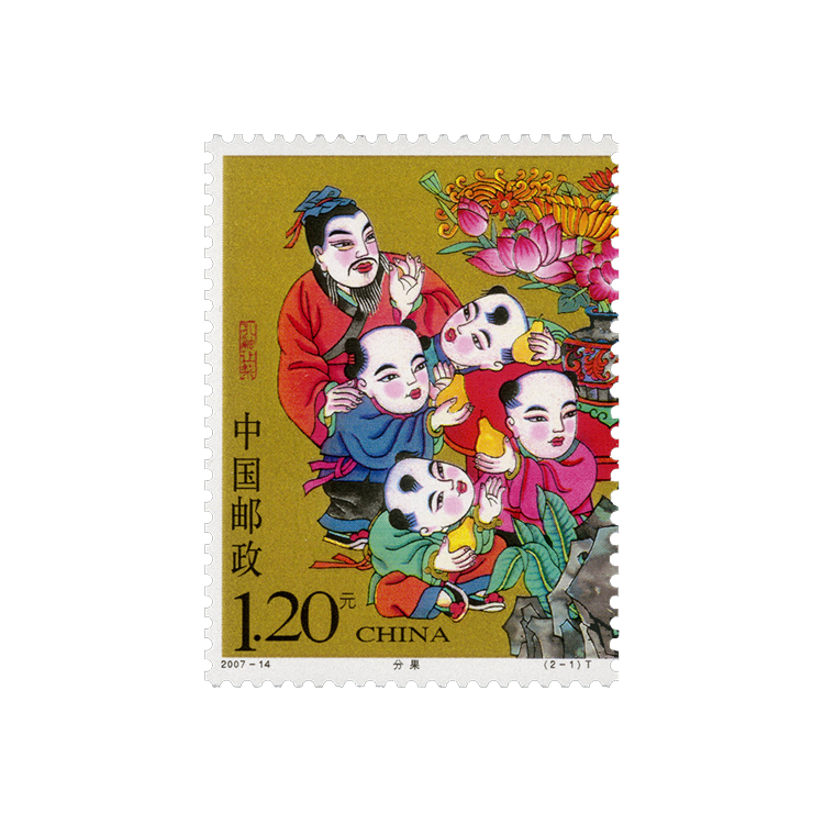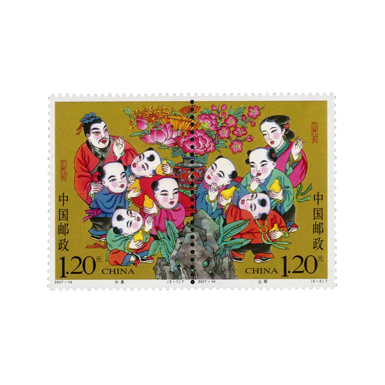 2007年6月1日发行《孔融让梨》特种邮票1套2枚,小本票(不干胶品种)1本。