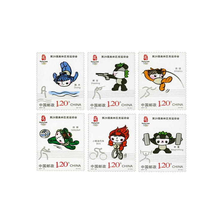 2007年8月8日发行《第29届奥林匹克运动会-运动项目(二)》纪念邮票1套6枚。
