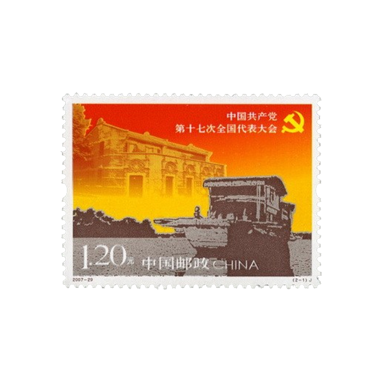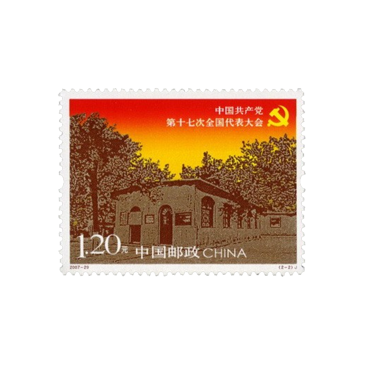 国家邮政局于2007年10月15日发行《中国共产党第十七次全国代表大会》纪念邮票一套2枚,小型张1枚。2枚邮票图名分别为:中共“一大”会址和中共“七届二中全会”会址。小型张图名为:中国共产党第十七次全国代表大会。