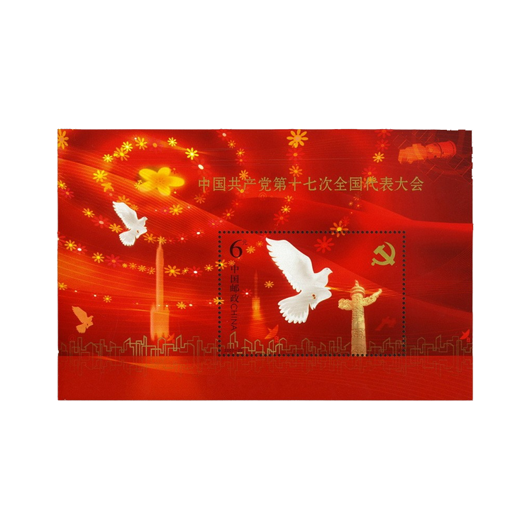 2007年10月15日发行《中国共产党第十七次全国代表大会》纪念邮票1套2枚,小型张1枚。