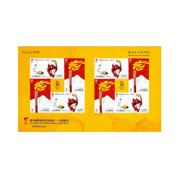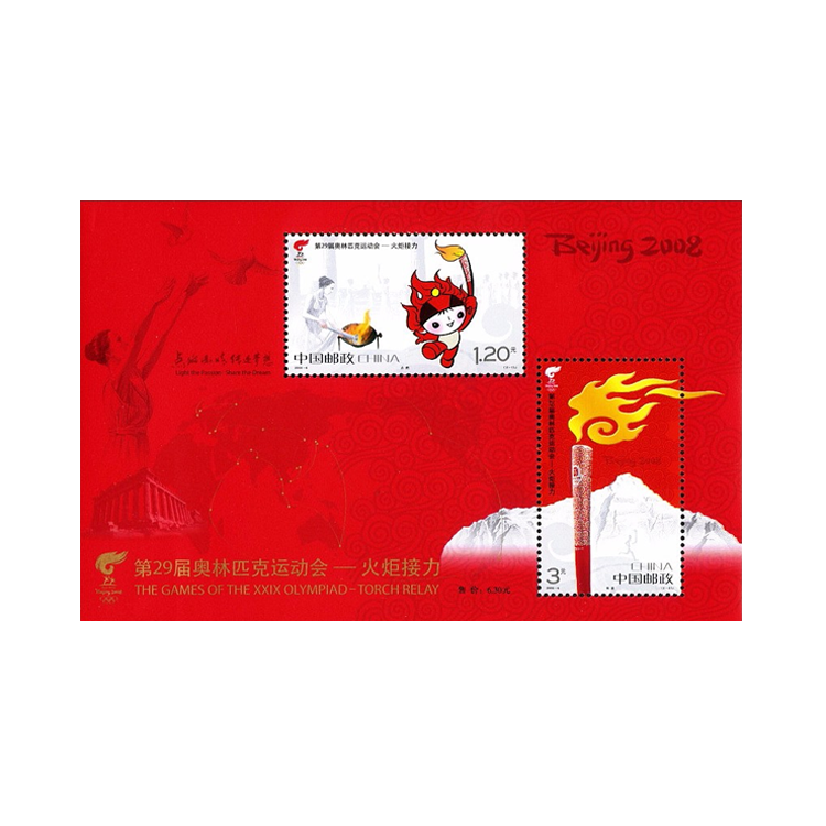 2008年3月24日发行《第29届奥林匹克运动会-火炬接力》纪念邮票1套2枚,小全张1枚。