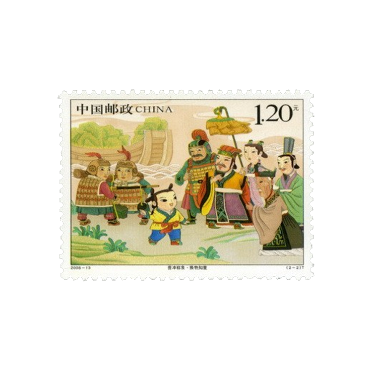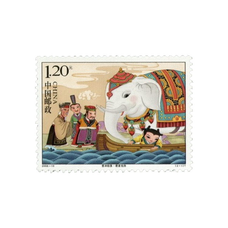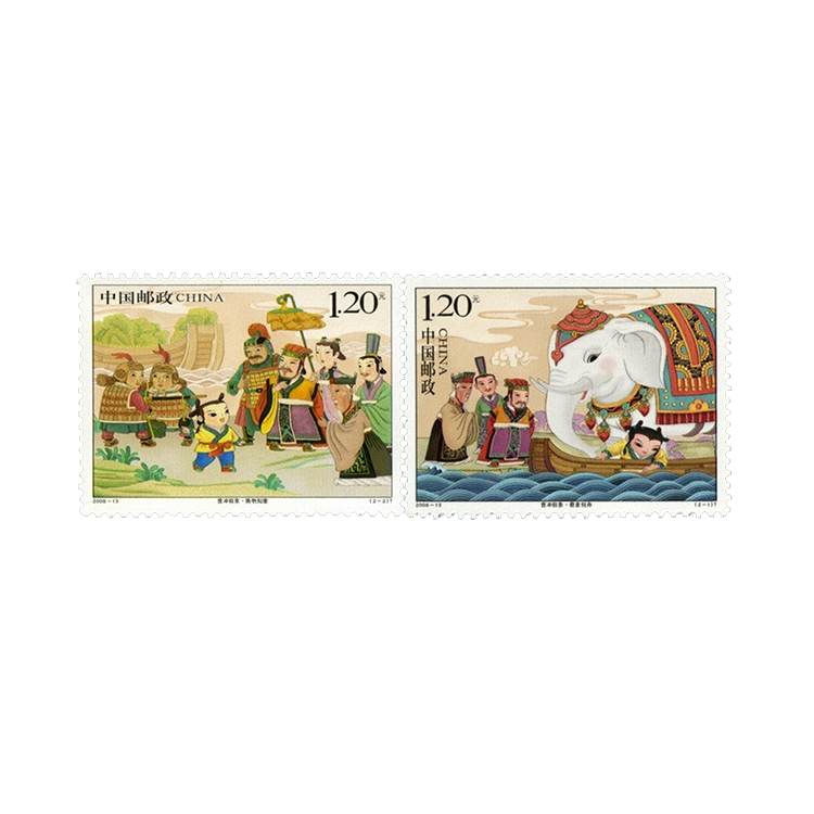 2008年6月1日发行《曹冲称象》特种邮票1套2枚,小本票(不干胶品种)1本。