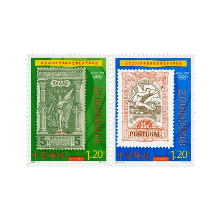 第一枚主图选取的是希腊发行的世界上第一套奥运题材邮票中的一枚,第二枚主图选取的是葡萄牙发行的世界上第一套有五环标志邮票中的一枚。这两个“第一”不仅与全球首届奥博会在意义上相合,而且本身就是一种强烈的文化符号,能充分发挥票中票对重大文化事件进行纪念的意义。