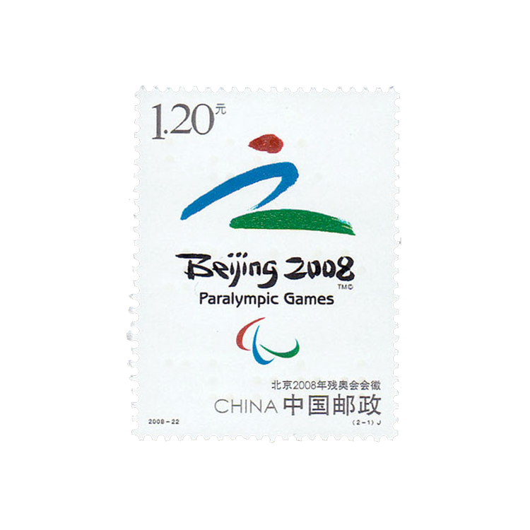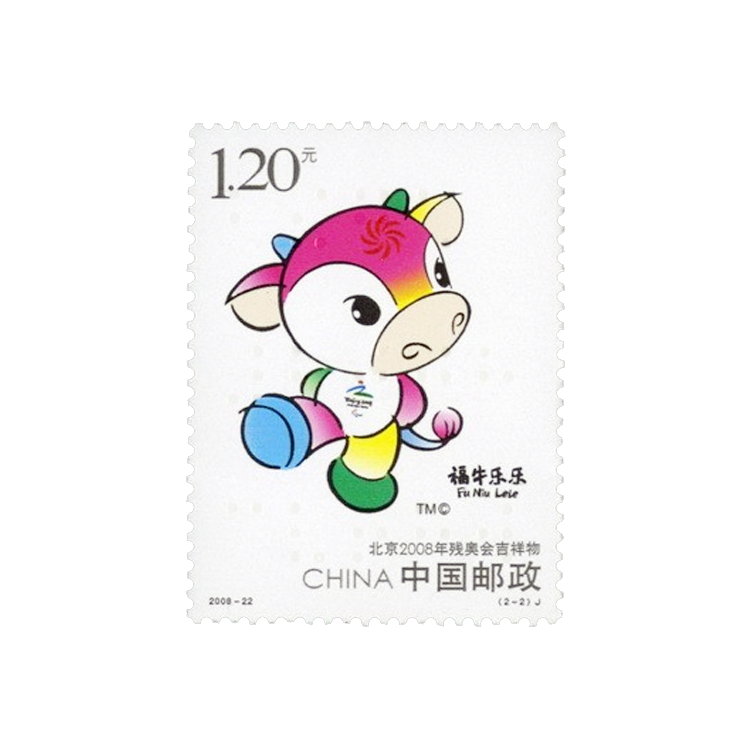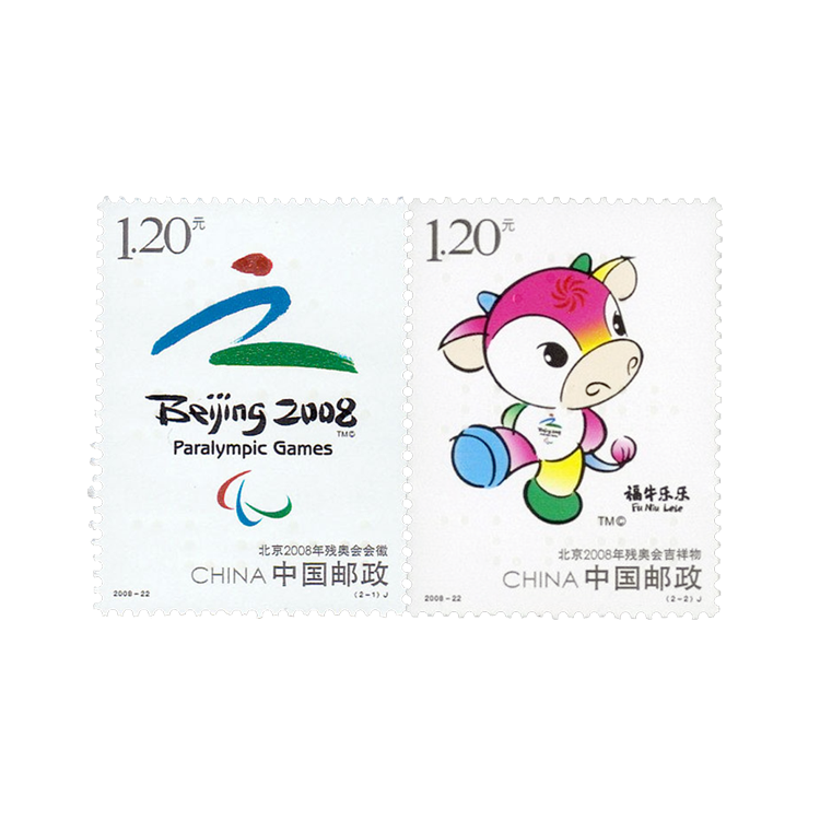 残疾人奥林匹克运动会,是专为残疾人举行的世界大型综合性运动会。2008年9月6-17日,北京2008年残奥会在中国北京隆重举行,实现了中国对世界“两个奥运,同样精彩”的庄严承诺。为了表现这种纪念意义,中国邮政特发行了《北京2008年残奥会》纪念邮票,全套2枚,面值均为1.20元。这套邮票的发行时间为2008年9月6日,正值开幕当天,更具纪念意义。为了使这套邮票更为完美,特请邮票设计师刘波精心设计,并交由北京邮票厂印制。这套邮票的票名分别为“北京2008年残奥会会徽”和“北京2008年残奥会吉祥物 ”,并以其为主图,会徽把中国的文字、书法和残奥会运动精神融为一体,吉祥物选牛为形象,名为“福牛乐乐”,蕴含着残疾人运动员自强不息和顽强拼搏的精神,面值位于邮票左上角,“CHINA中国邮政”字样位于邮票右下角。两枚邮票与残奥会“超越、融合、共享”的理念完美契合。