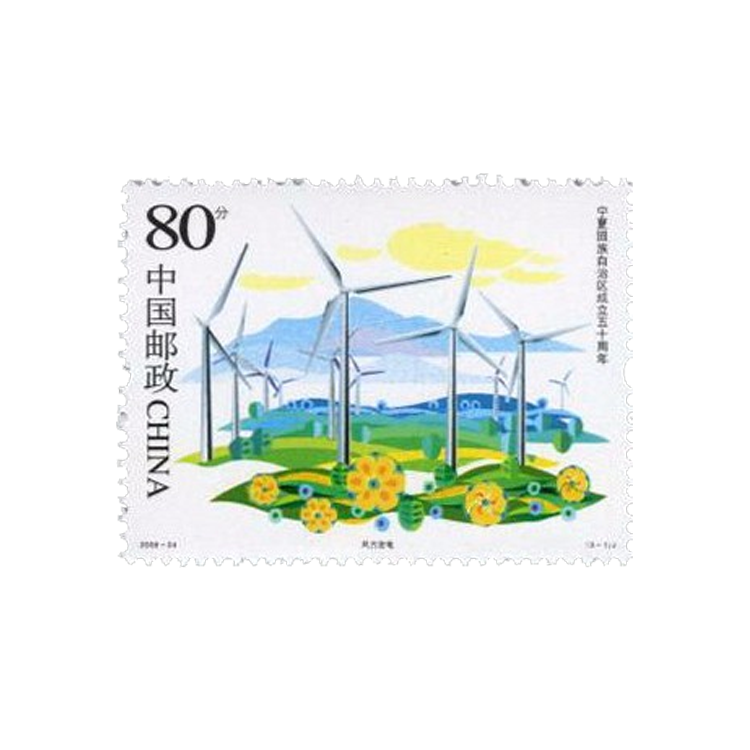 这次发行的3枚邮票设计者为侯德。邮票第1枚是“风力发电”,面额80分。票面图案是一排排交错成行的风力发电机,在贺兰山的衬映下,错落有致,雄伟壮观。宁夏风能资源丰富,许多地方适合建大型风电厂。高耸的风塔、不停转动着的叶片,不仅将生生不息的风转化成源源不断的电,使我们的生活变得更加光明,而且给贺兰山增添了一道美丽风景线。如今,宁夏的风力发电在全国的比重,已经由第7位上升为第1位。