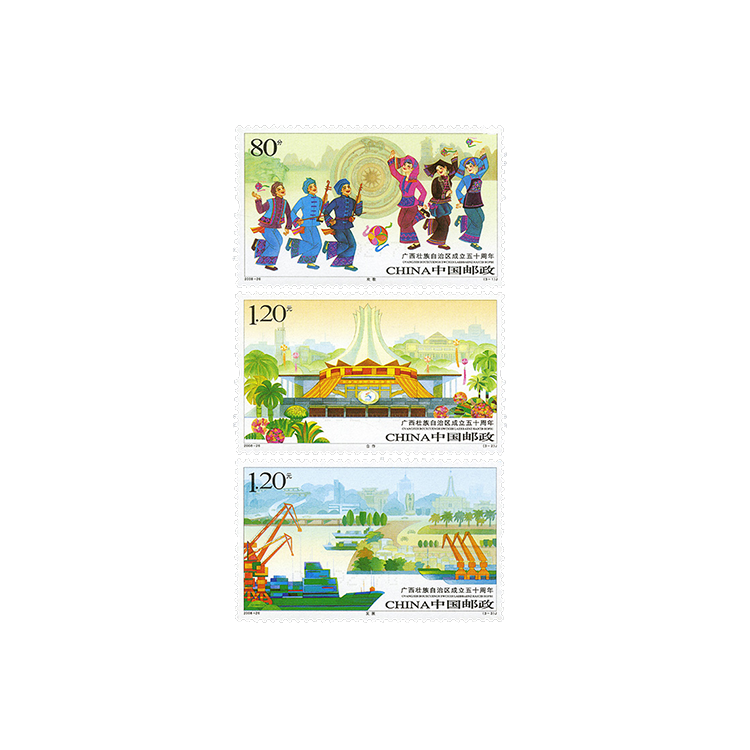 2008年10月18日发行《广西壮族自治区成立五十周年》纪念邮票1套3枚。