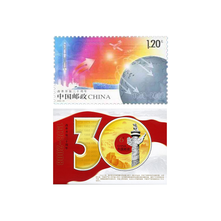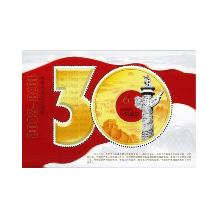 2008年12月18日,发行《改革开放三十周年》纪念邮票1套1枚,小型张1枚。