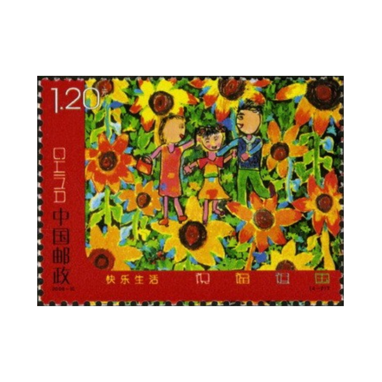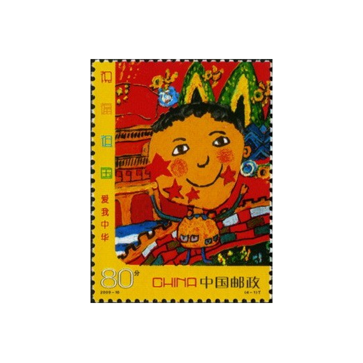 为了纪念中华人民共和国建国60周年,反映60年来我们的国家、民族和社会的巨大变化以及取得的辉煌成就,表达广大少年儿童对祖国的深情和热爱,邮票发行部门与中国美协儿童美术艺术委员会联合在全国开展了“祝福祖国”邮票的儿童画征稿活动。最终以来自“儿童画之乡”江苏的4幅儿童画作品被选为邮票团。儿童画笔法稚拙可爱,设色艳丽大胆,想想丰富,感情真挚。