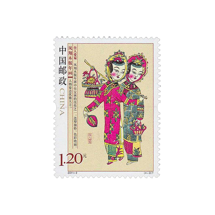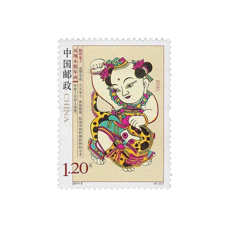 我国自2003年开始安排年画系列邮票,目前已为杨柳青、桃花坞、杨家埠、武强、绵竹、朱仙镇、漳州、梁平等地的年画发行过8套邮票。凤翔年画为西北地区的民间艺术,产于陕西凤翔,始创于明正德初年,题材广泛。凤翔年画以手工雕版,土法印制,局部手绘染填,套上金银二色,色彩对比强烈,造型饱满夸张,保留了木版年画古朴自然的艺术风格。它数百年间流行于陕、甘、宁、青、川广大地区,深受民众喜爱。凤翔年画以古朴优美、风格独特的面貌在中国木版年画中独树一帜,与它的历史渊源、地域特色是分不开的。