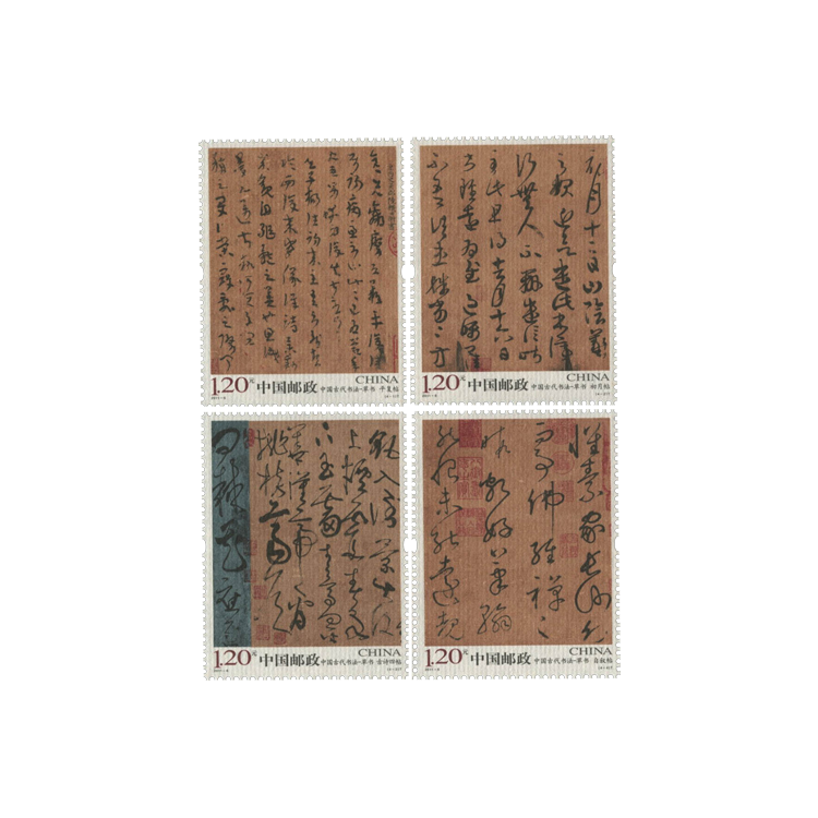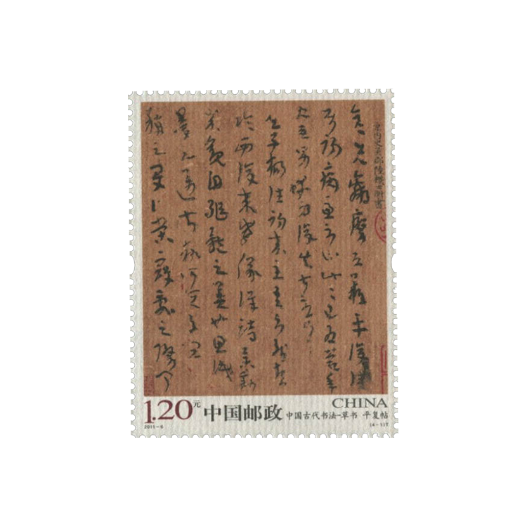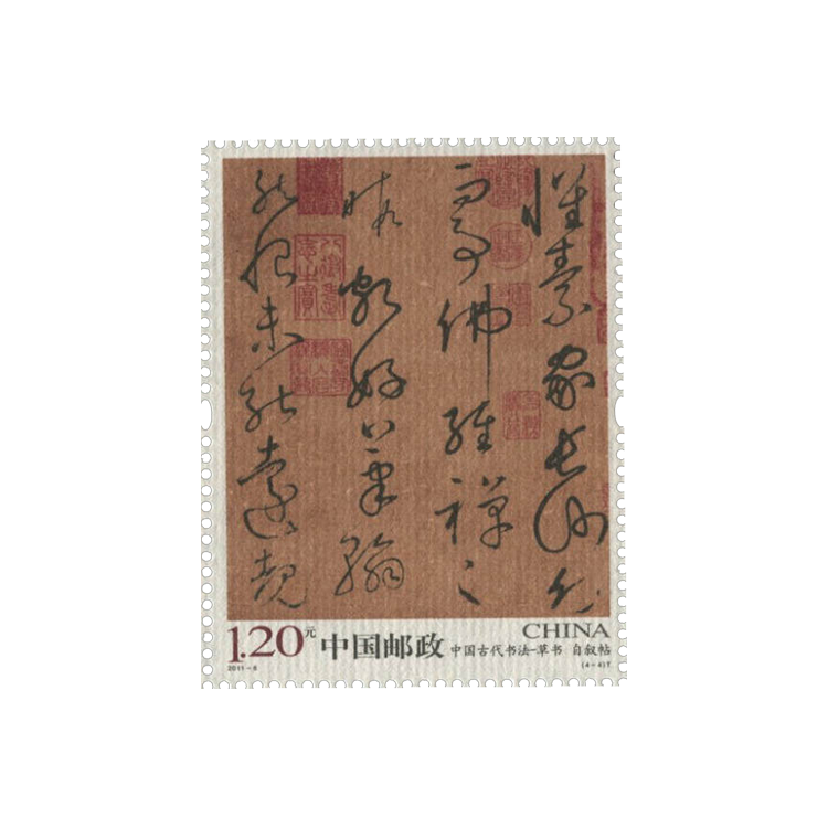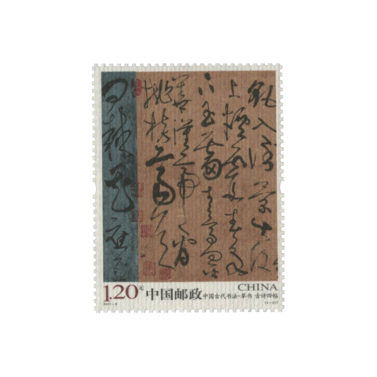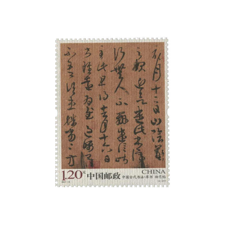 中国邮政定于2011年4月15日发行《中国古代书法-草书》特种邮票1套4枚。邮票内容拟表现《平复帖》(陆机)、《初月帖》(王羲之)、《古诗四帖》(张旭)、《自叙帖》(怀素)等。该邮票由王虎鸣设计,北京邮票厂印制。