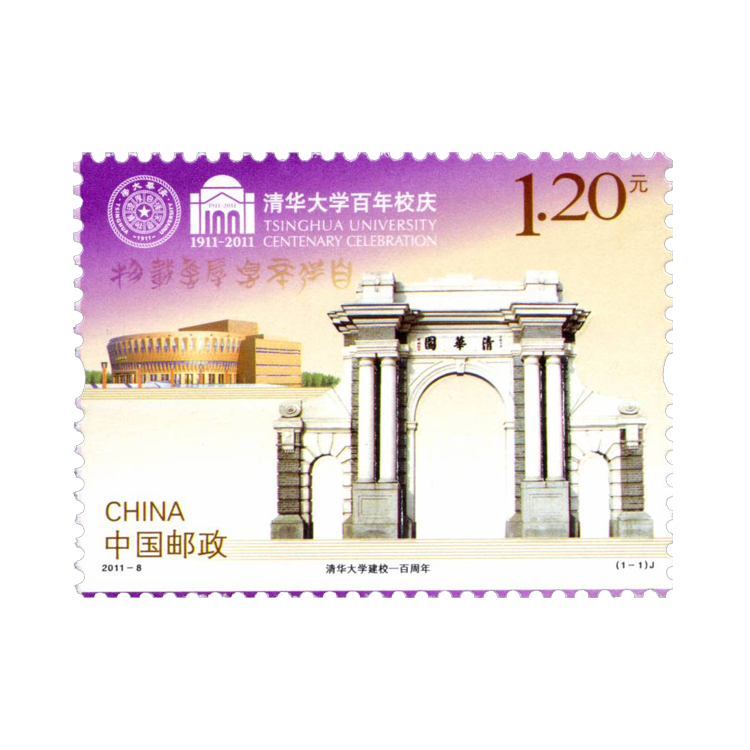 为纪念清华大学100周年华诞,中国邮政于2011年4月24日发行《清华大学建校一百周年》纪念邮票,一套一枚,面值1.2元。邮票图案由清华大学美术学院何洁教授设计,主体色彩采用清华大学校色-紫色,主图为清华大学二校门及新清华学堂、清华校训“自强不息,厚德载物”以及清华百年校庆标志,整体设计生动体现了百年清华的人文理念和崭新风貌。