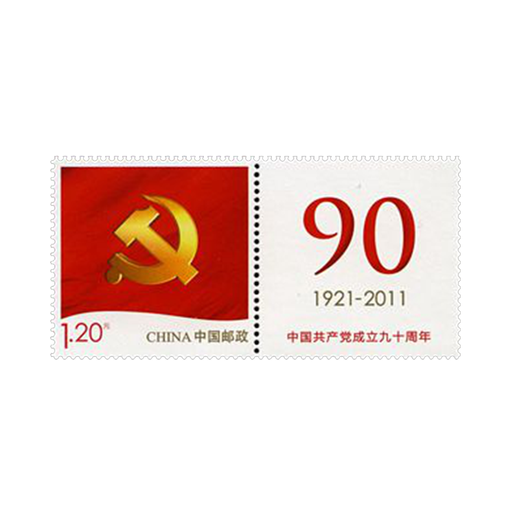 这枚邮票的发行是为了庆祝中国共产党成立九十周年。邮票的主景图案为中国共产党的党徽,庄重肃穆。党徽由镰刀和锤子组成,金黄色象征光明,并以红色作为背景色调。镰刀和锤子都是工人和农民的劳动工具,这象征着中国共产党是以工农联盟为基础的代表广大人民群众根本利益的先锋队,寓意深刻。