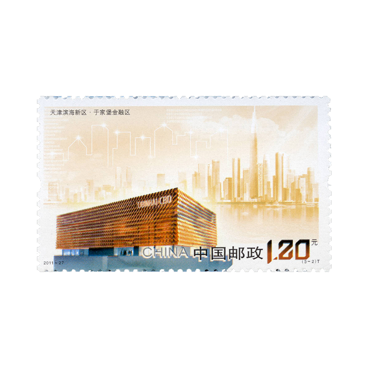 (3-2)邮票《天津滨海新区于家堡金融区》于家堡金融区位于于家堡半岛,是滨海新区中心商务区的核心地区,目前是全球最大规模的金融商务区。该枚邮票以艺术化的表现手法将新区金融商务蓬勃发展态势浓缩于方寸之中,色彩绚丽璀璨、金碧辉煌。