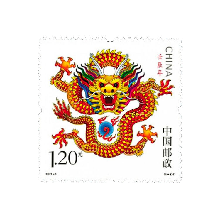 2012壬辰龙年生肖邮票设计灵感来源于皇帝龙袍前胸织绣正金龙图案,并参考了清代琉璃九龙壁的造型及色彩。画面采用了龙正面角度,力求表现出龙的雍容与威严。画面色彩丰富而艳丽,既有皇家气度,又具有喜庆氛围。在封建王朝时代,龙是帝王权威的象征,在民间,龙主要是以辟邪降福而被人们膜拜。人们将龙视为降魔趋避的神物,故而形象威严。由陈绍华设计。