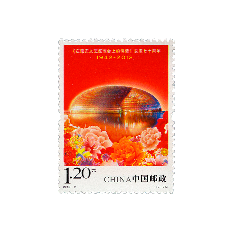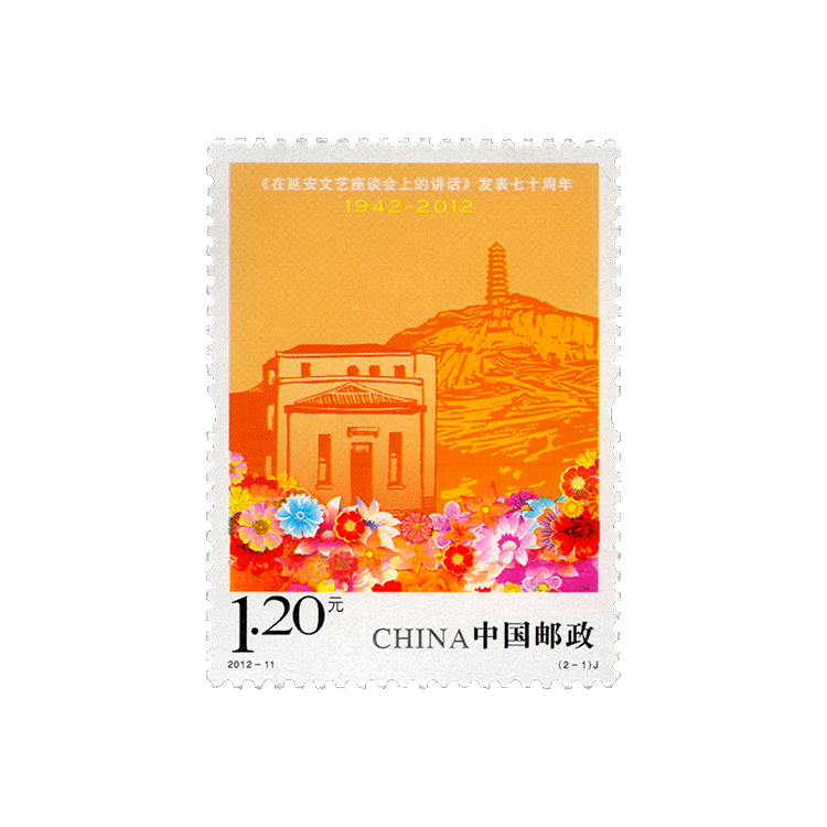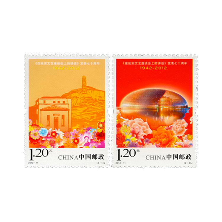 中国邮政定于2012年5月23日发行《〈在延安文艺座谈会上的讲话〉发表七十周年》纪念邮票1套2枚。