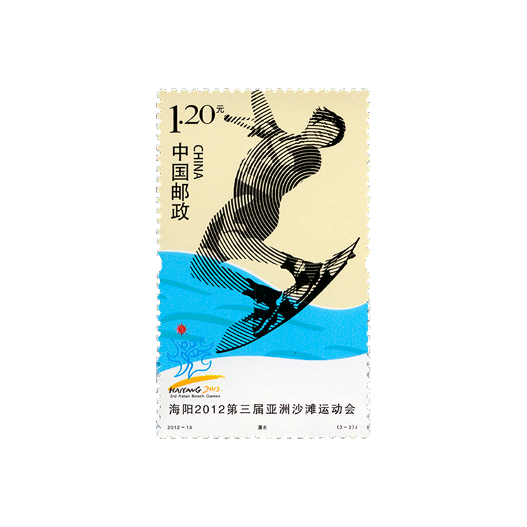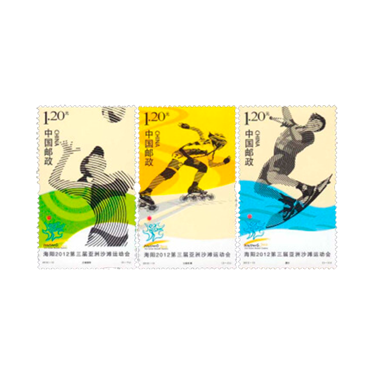 为庆祝第三届亚洲沙滩运动会将于2012年6月16日至22日在中国山东海阳举办,中国邮政定于2012年6月16日发行《海阳2012第三届亚洲沙滩运动会》邮票一套3枚。邮票表现的体育项目分别为沙滩排球、公路轮滑、滑水。