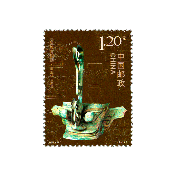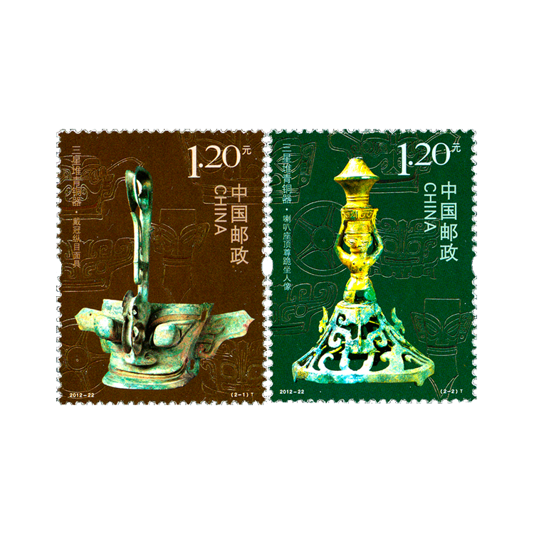 中国邮政定于2012年9月26日发行《三星堆青铜器》特种邮票1套2枚,小型张1枚。两枚邮票选取的三星堆青铜器文物为戴冠纵目面具、喇叭座顶尊跪坐人像,邮票小型张体现的青铜器文物为大立人像。