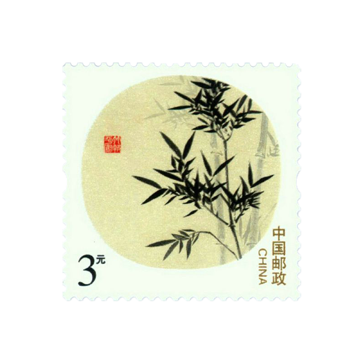 《竹报平安》邮票图案为绘有墨竹的团扇,扇面上还有一方“竹报平安”的篆刻印章,整体画面古色古香由设计师尚盈设计。