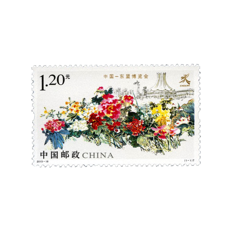 2013年8月15日将发行的《中国—东盟博览会》邮票规格为50毫米×30毫米,面值为1.20元。邮票设计以中国、东盟11个国家的名花为主图,配以东盟博览会的会徽、永久举办地广西南宁国际会展中心元素,运用写意手法充分表现中国—东盟博览会友谊、合作、繁荣、发展的主题,象征着中国与东盟国家合作的前景繁花似锦。