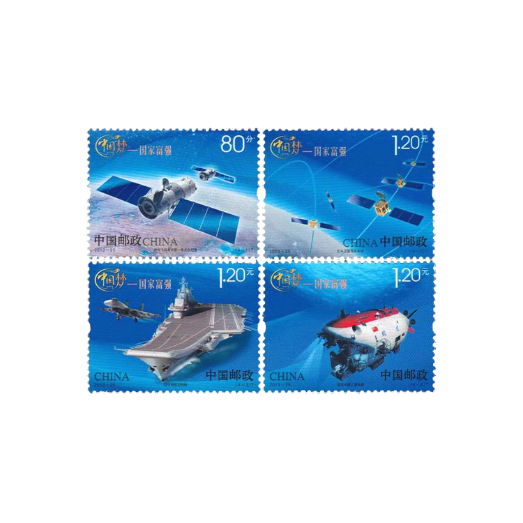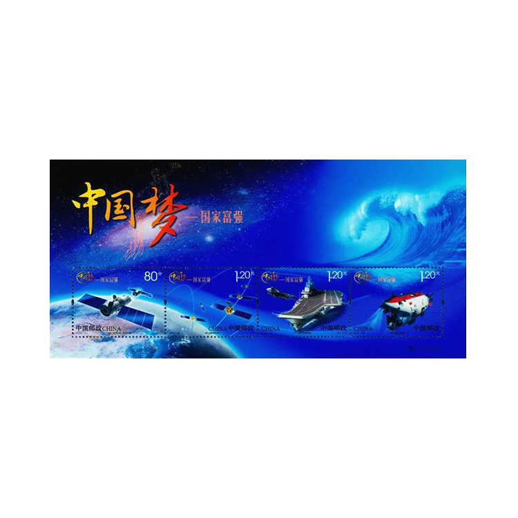 中国邮政定于2013年9月29日发行《中国梦—国家富强》特种邮票1套4枚,小全张1枚。