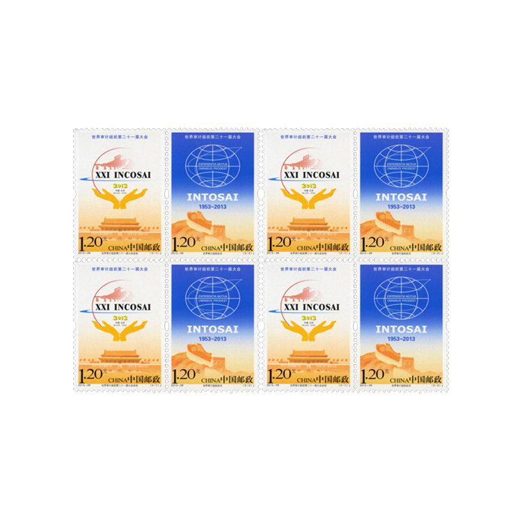 世界审计组织成是世界各国最高审计机关信息交流、技术合作和培训研讨的主要平台。2013年10月22日,世界审计组织第二十一届大会开幕式在北京人民大会堂举行,中国人首次担任新一届世界审计组织主席,格外有纪念意义。在此之际,中国邮政特于当日发行《世界审计组织第二十一届大会》纪念邮票,全套两枚,面值均为1.20元人。两枚邮票图案分别是“世界审计组织第二十一届大会会标”和“世界审计组织标志”,并以其为主图,特请邮票设计师沈嘉宏精心设计,构图和谐,并由辽宁省沈阳邮电印刷厂印刷而成。会标图案主要是由中国长城、地球和托举的双手构成,在富含中国特色的同时,又充分体现了中国愿意同各国审计机关一道,携手共进,突出沟通、友谊、交流和发展的主旨。