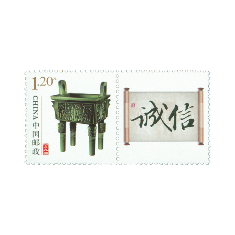 该个性化邮票以鼎为主图,寓意诚信(一言九鼎)。带有空白附票的此套邮票专用于个性化服务业务,另有附票带有“诚信”字样的该专用邮票同时发行。