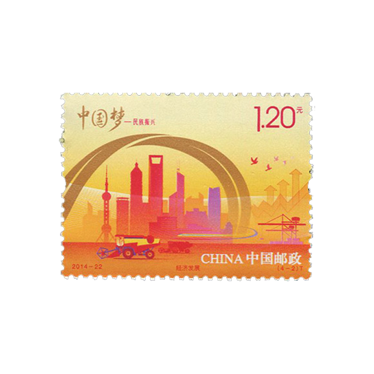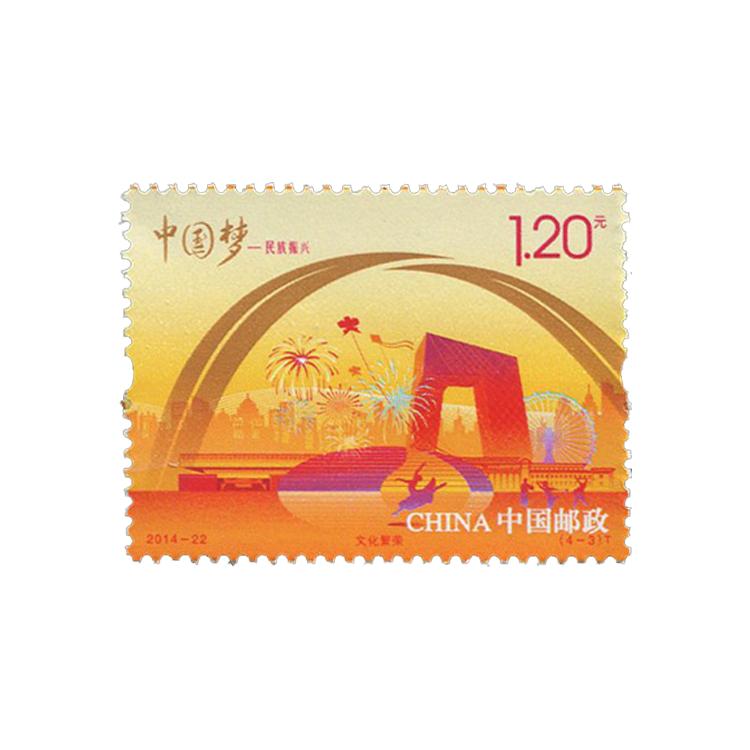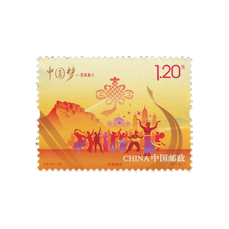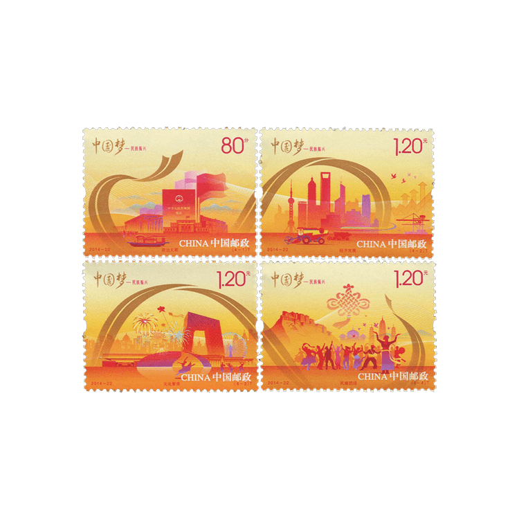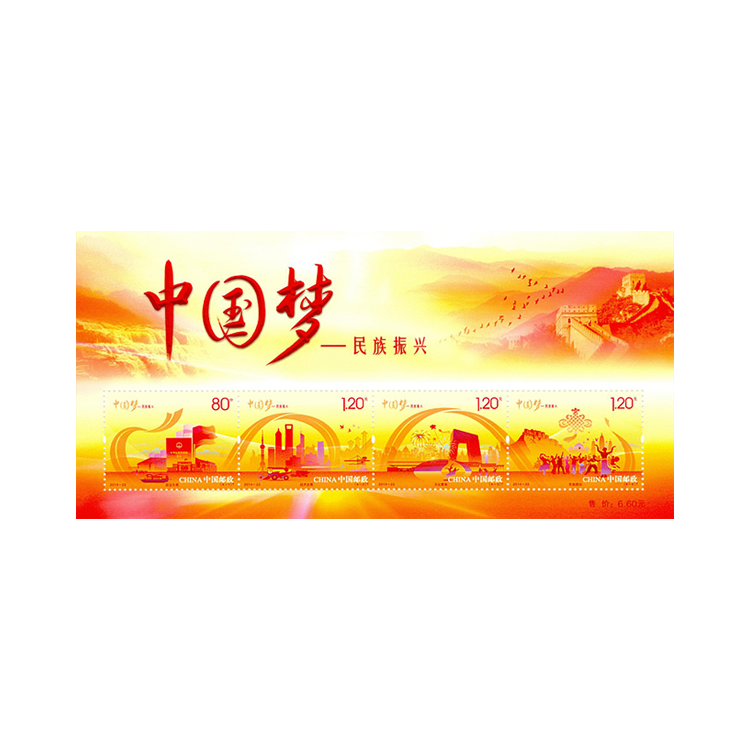中国邮政定于2014年9月20日发行《中国梦-民族振兴》特种邮票1套4枚,小全张1枚。