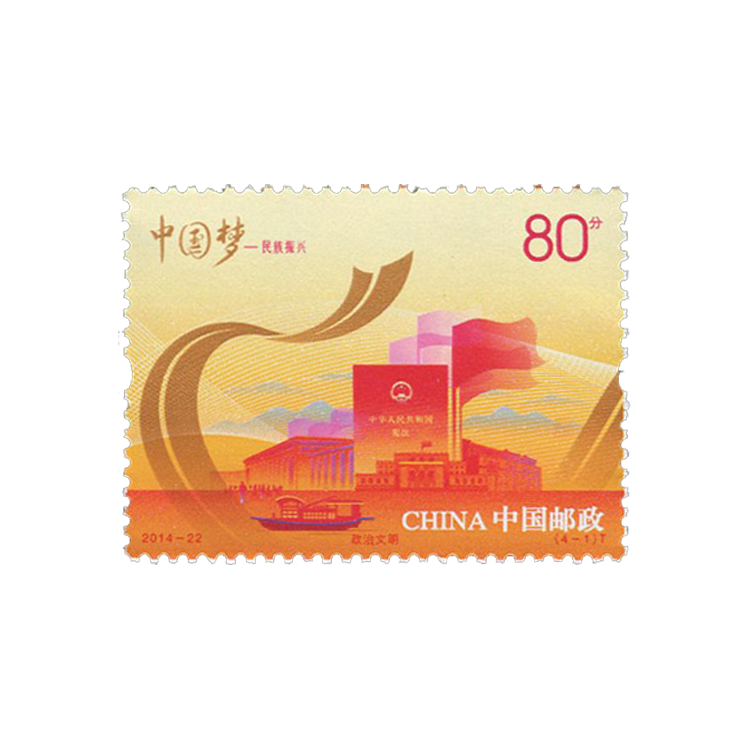 该套邮票图稿艺术地反映了“中国梦—民族振兴”的主题,以腾飞的金丝带贯穿画面,寓意着中华民族的振兴。邮票内容分别从政治文明、经济发展、文化繁荣、民族团结等四个方面进行阐释,表现出我国社会主义制度的巨大优越性,展现了改革开放以来我国在经济、文化方面所取得的辉煌成就和繁荣景象,寓意祖国各民族团结一心、幸福和谐的美好愿景。