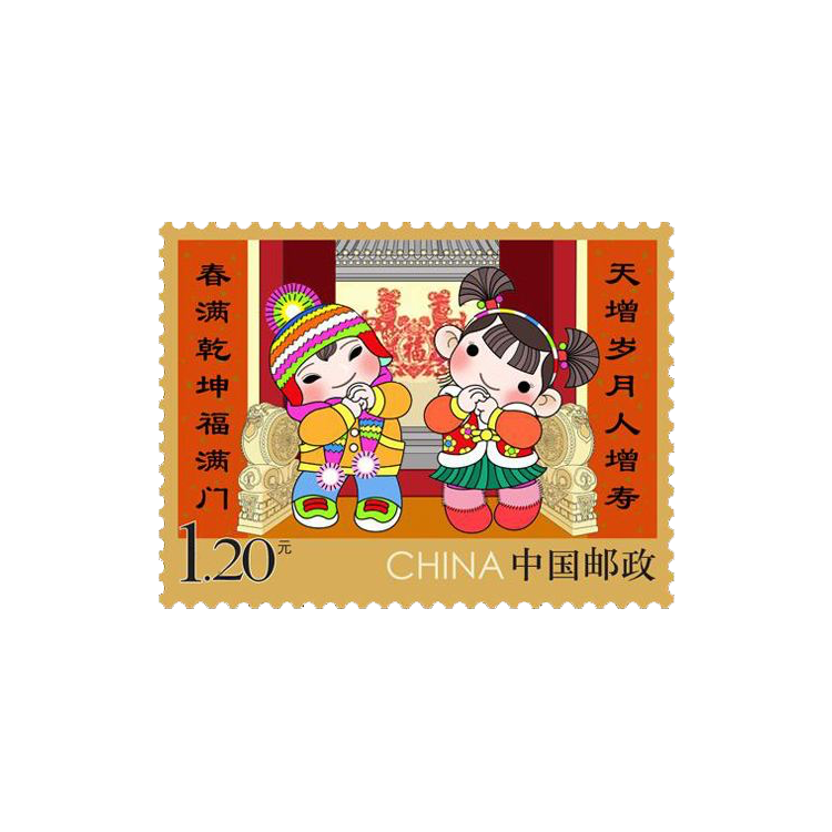 邮票以两个卡通形象的儿童为主要元素,衣着、配饰具有现代特点,旁边是代表中国建筑文化的门墩,以及中国传统节日—春节时家家户户都会张贴的一副对联。卡通形象的背后是朱漆大门,象征着富裕、殷实。门内有照壁一方,上贴福字和剪纸风格的羊形象。整个画面烘托出过年的热烈气氛。形象活泼鲜明,内容准确生动。整个画面既突出浓浓的传统节日气氛,又与现代接轨,现代形象的卡通儿童将现代人过大年,拜大年时的场景栩栩如生的展现在人们眼前。邮票以两个卡通形象的儿童为主要元素,衣着、配饰具有现代特点,旁边是代表中国建筑文化的门墩,以及中国传统节日—春节时家家户户都会张贴的一副对联。卡通形象的背后是朱漆大门,象征着富裕、殷实。门内有照壁一方,上贴福字和剪纸风格的羊形象。整个画面烘托出过年的热烈气氛。形象活泼鲜明,内容准确生动。整个画面既突出浓浓的传统节日气氛,又与现代接轨,现代形象的卡通儿童将现代人过大年,拜大年时的场景栩栩如生的展现在人们眼前。"新年快乐"、“身体健康”等吉祥的话语,左右邻居或亲朋好友亦相互登门拜年或相邀饮酒、礼尚娱乐。