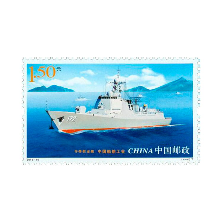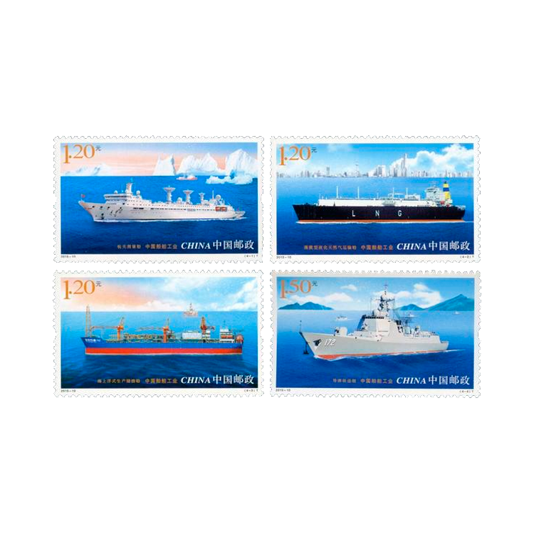 中国邮政定于2015年6月3日发行《中国船舶工业》特种邮票1套4枚,内容分别为航天测量船、薄膜型液化天然气运输船、海上浮式生产储油船、导弹驱逐舰。全套邮票面值为5.10元。