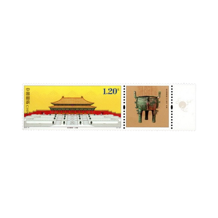 (4-2)T 太和殿面值1.20元副票图案:西周水鼎,三足两耳,造型寓方于圆,纹饰简洁雅致,鼎内有表明所有者身份的铭文“水”,亦称雨鼎。1929年因地方军阀盗掘而出土于陕西宝鸡斗鸡台。同时出土的周代量鼎彝重器多流散海外,此鼎为幸存国内的少数几件之一,由收藏者个人捐献入宫。鼎圆腹,二直耳,三足形状界于柱足与马蹄足之间。腹上均匀地分部四道扉棱,其中两道与二耳和二足相对应;另两道,一道与一足相应,另一道在与二耳与二足相对应的两道扉棱之间。颈部饰两组张口卷尾的对夔纹。腹周饰一圈竖直线纹,直线纹下再饰三角形的垂叶纹。三足饰兽面纹和弦纹。器内底铸铭“水”字,为器物所有者的名或家族族徽。水鼎整体造型雅致,腹和足上的出戟增强了造型上的优美。颈、腹上的纹饰,尤其是简洁直线纹的的采用,使花纹整体独特而雅致。