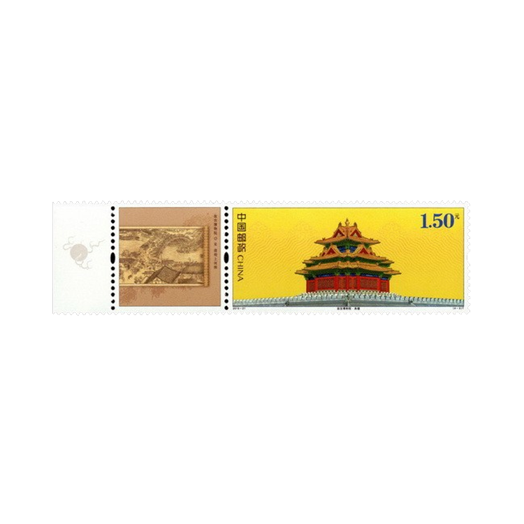 (4-3)T 角楼面值1.50元副票图案:北宋画院张择端的风俗画巨作《清明上河图》,以线条为主,生动再现了北宋京都汴梁汴河两岸村镇、市街、城郭中人烟稠密、舟车往来的热闹景象。细节刻画精微,人物各具情态,并从全局着眼,起承转合,余味无穷。此图收藏历经波折,清中期重入内府后,又于民国年间被溥仪携带出宫,流散东北,1958年才得重归紫禁城,成为故宫藏品中妇孺皆知的丹青至宝。