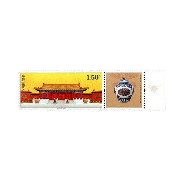 (4-4)T 乾清门面值1.50元副票图案:元代青花釉里红开光镂花盖罐。青花釉里红是元代景德镇工匠创烧的釉下彩品种。1965年出土于河北保定元代窖藏、调拨入藏故宫博物院的元景德镇窑青花釉里红镂雕盖罐是该品种的代表性器物。此罐造型敦厚,装饰繁缛,罐腹开光内镂雕四季花卉,红蓝交辉,花团锦簇,工艺精湛,堪称绝品。