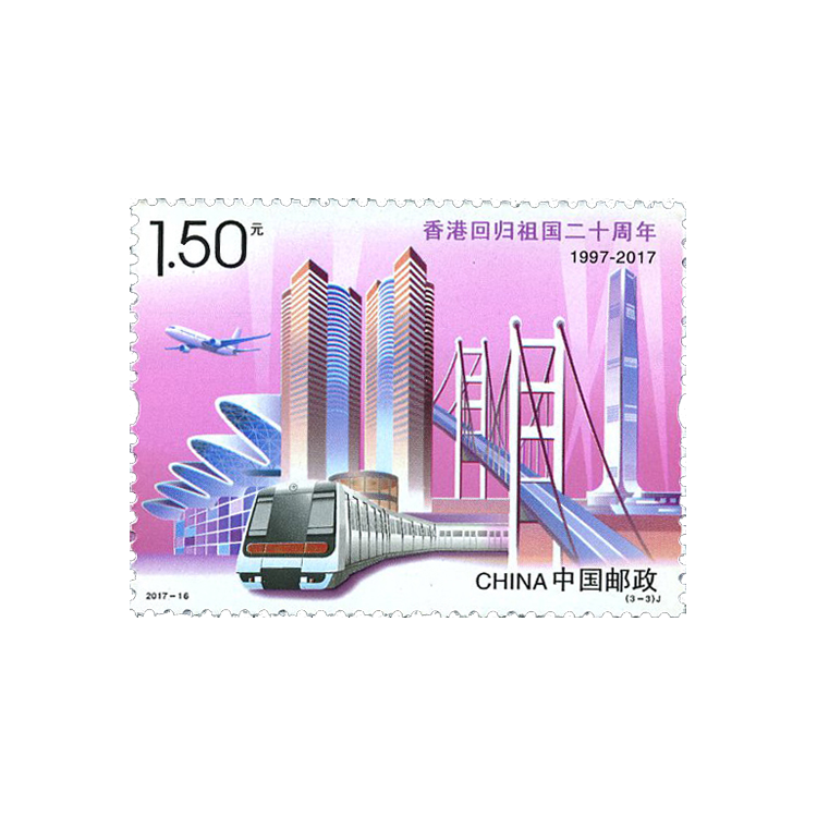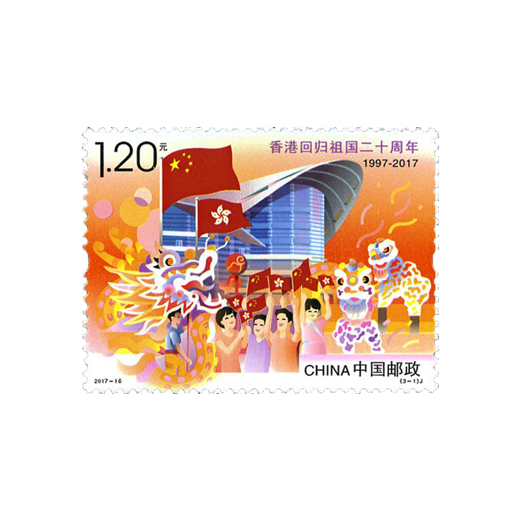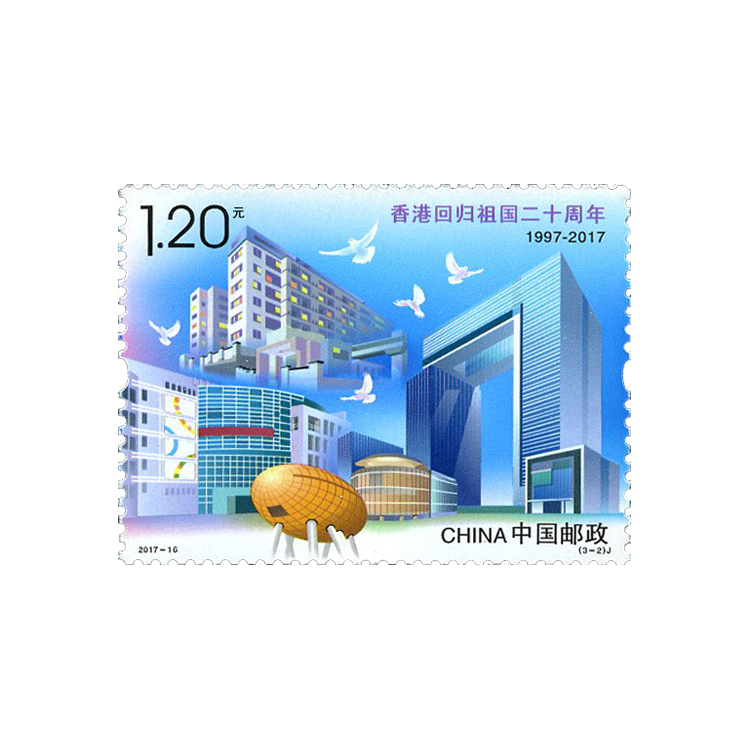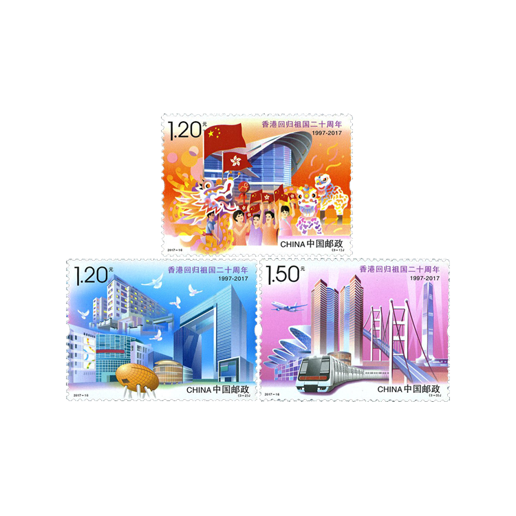 中国邮政定于2017年7月1日发行《香港回归祖国二十周年》纪念邮票一套3枚。