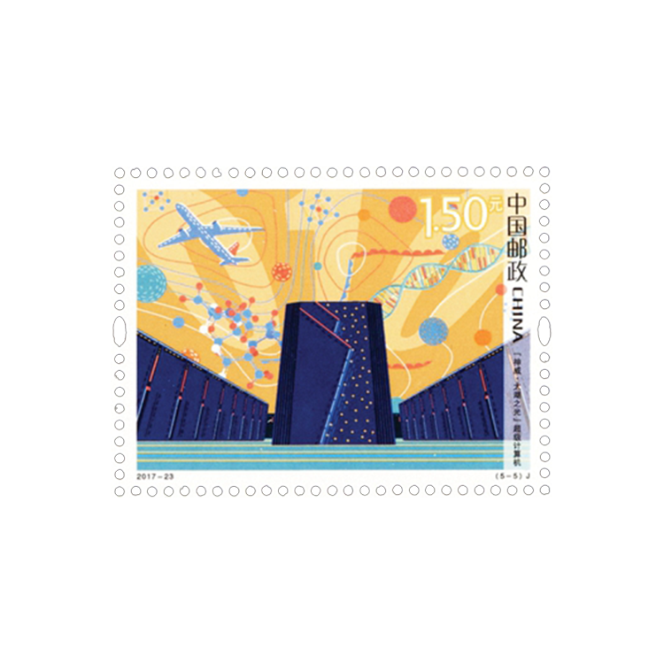第五枚“神威·太湖之光”超级计算机,邮票画面以位于江苏省国家超级计算无锡中心的超级计算机机柜为主体元素,画面背景表现了超级计算机在航空航天、天气气候、生物信息、材料科学、计算化学等国家高科技领域和尖端技术研究中的广泛应用。紫外光下,计算机发射的代表二进制的“0”和“1”视觉化了不能被看见的超级运算能力。