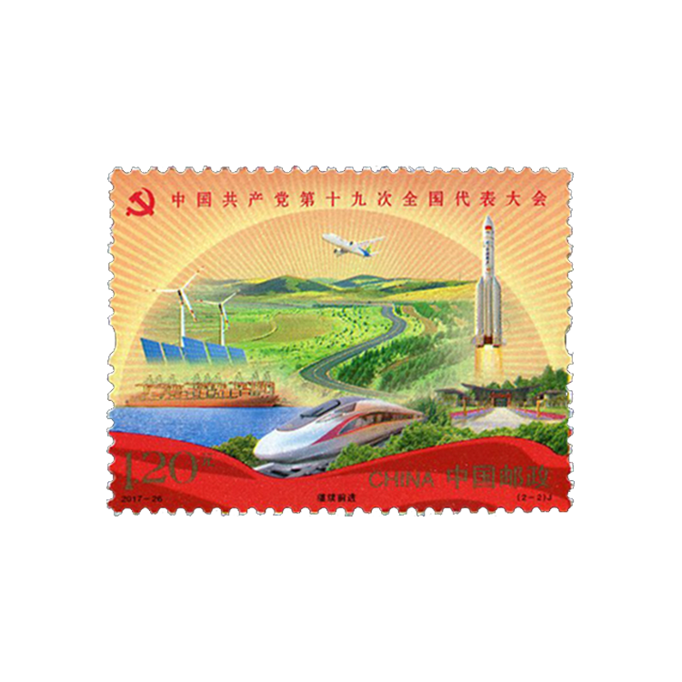 邮票第二图通过“复兴号”高铁、风力发电、太阳能、国产C919大飞机、“2017一带一路国际合作高峰论坛”主会场、火箭等元素,展现了十八大以来我国在政治、经济、科技、生态文明建设等方面取得的辉煌成就,突出“一带一路”重要战略,贯彻创新、协调、绿色、开放、共享的发展理念,以此体现中国共产党带领中国人民不断把实现中华民族伟大复兴事业推向前进。