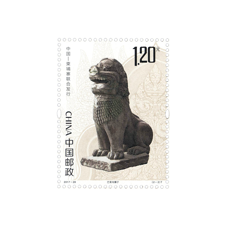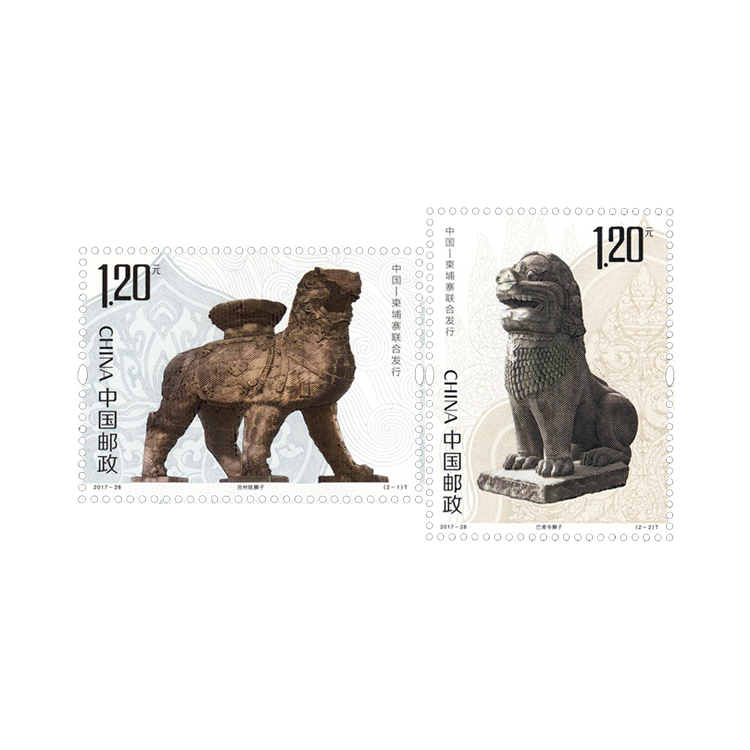 为增进中柬两国人民的相互了解和友谊,中国邮政和柬埔寨邮政决定联合发行《沧州铁狮子与巴肯寺狮子》特种邮票。邮票分别展现的是位于中国河北省沧州市沧县旧州镇的铁狮子和位于柬埔寨吴哥城南郊巴肯寺中的石狮子。沧州铁狮子高5.48米,重约40吨,背负莲花巨盆,昂首怒目,仰天长吼,距今已有1000多年的历史,是我国古代铁铸艺术中的一大珍品。狮子形象在柬埔寨也很受欢迎,常常出现在寺庙门或出入通道两侧。邮票上的石狮形象来自巴肯寺。巴肯寺是一座建于公元10世纪的印度教寺庙。寺庙呈金字塔形,台基五层,有石阶通往台顶,每层台基均有一对石狮守护左右。邮票上的石狮位于入口处。