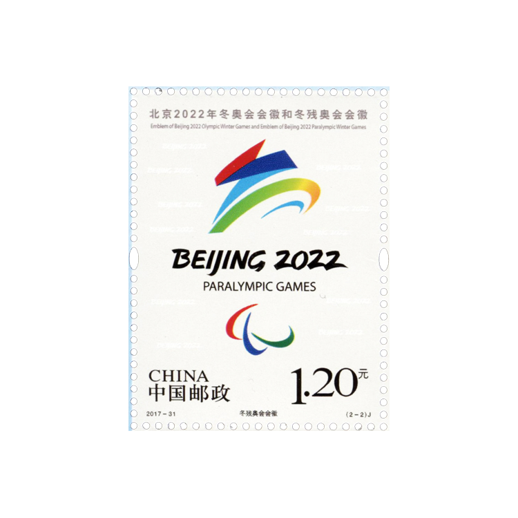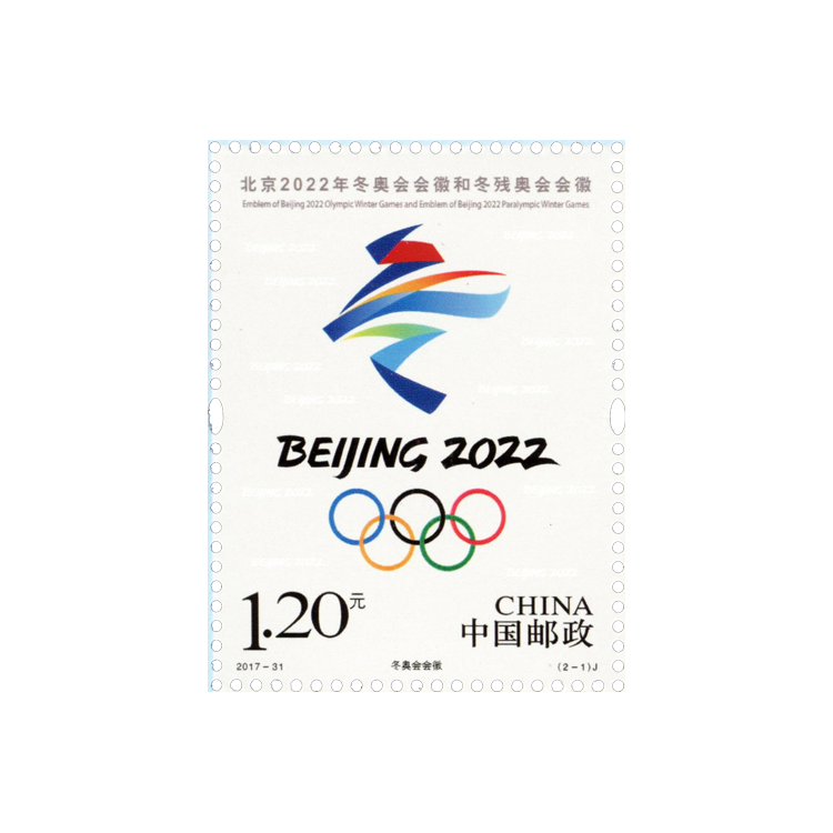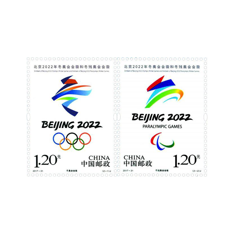 2017年12月31日中国邮政发行《北京2022年冬奥会会徽和冬残奥会会徽》纪念邮票,一套2枚。