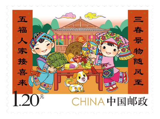 邮票画面中的粽子象征着富裕丰收,热情好客的壮家人过年时就会拿出最好的食物招待客人。绣球则是壮家人的吉祥物,是壮家人传递爱情、亲情、友情的民族文化使者。中间桌子上摆放着柚子、香蕉、五色饭等当地特色水果和食物,打开的石榴籽粒饱满、颗颗相抱,正如我国56个民族紧密团结在一起,形象贴切地表现出习近平总书记提出的“各民族要相互了解、相互尊重、相互包容、相互欣赏、相互学习、相互帮助,像石榴籽那样紧紧抱在一起。”的教导,寓意深刻、饱含期望、意境深远。背景衬以铜鼓和当地民居建筑,两侧的春联契合了“三春景物随风至,五福人家接喜来”的新春主题,整个画面轻松愉悦,洋溢着新年的喜庆画面。