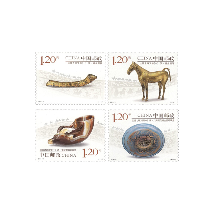 中国邮政定于2018年5月19日发行《丝绸之路文物(一)》特种邮票,一套4枚。