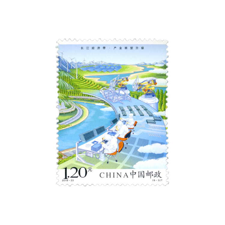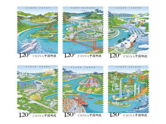 邮票以手绘方式生动展示了长江经济带全方位的发展成就。第一图描绘了长江经济带共抓大保护的发展理念和美丽的自然生态。第二图展现了长江经济带科学高效的综合立体交通走廊。第三图展示了长江经济带产业转型升级,加速培育新动能。第四图描绘了长江经济带以人为本的新型城镇化。第五图展现了长江经济带的开放新格局。第六图描绘了长江经济带的区域协调发展。