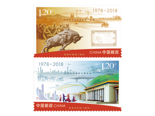 中国邮政定于2018年12月18日发行《改革开放四十周年》纪念邮票,一套2枚,小型张一枚。